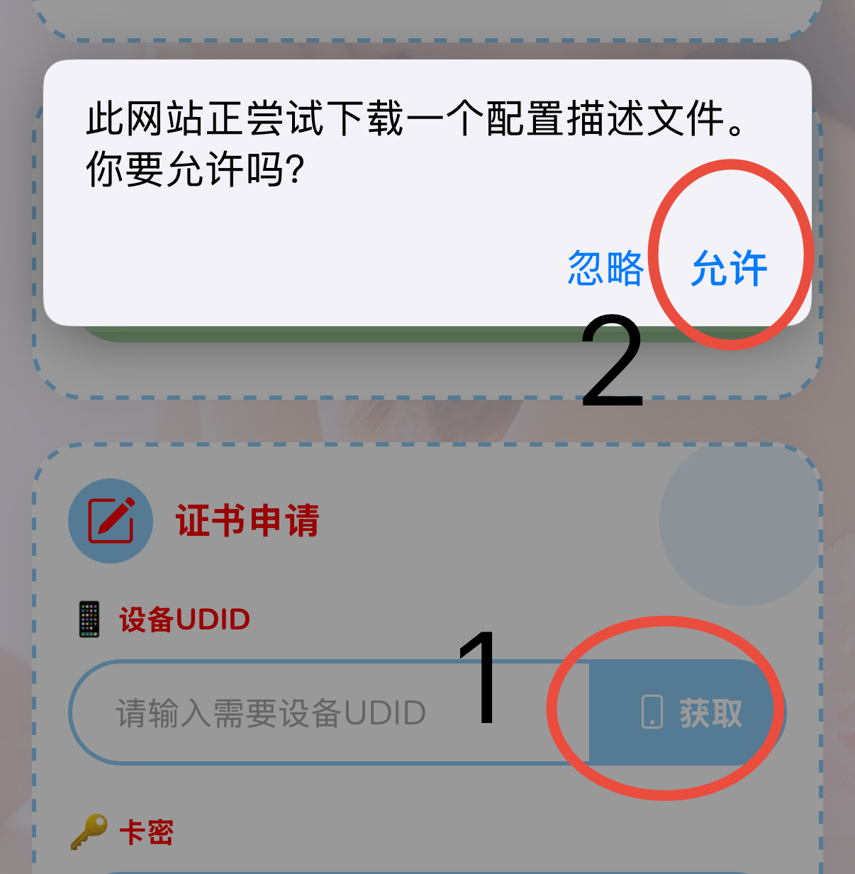 2.点击获取设备UDID,允许下载描述文件