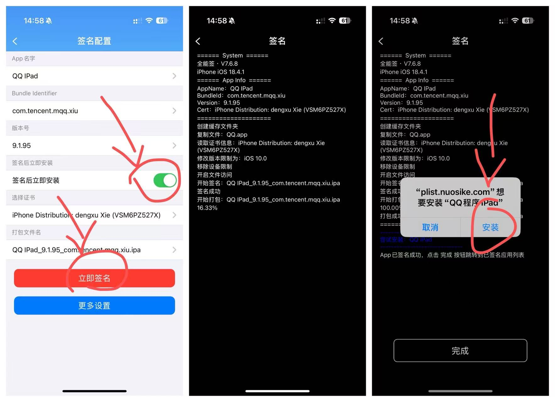 11.勾选签名后立即安装,然后点签名,最后面就是代码在执行中,等好了会提示你安装,然后返回桌面打开APP就可以了