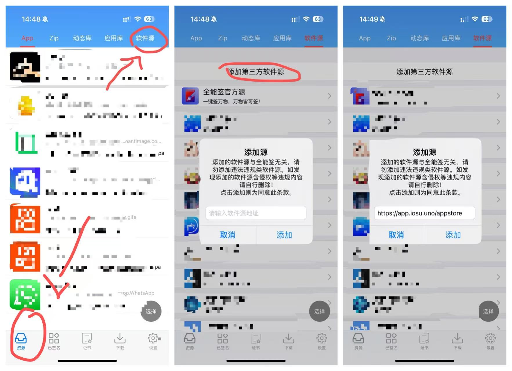9.点底部资源,点软件源,点添加软件源,软件页地址https://app.iosu.uno/appstore